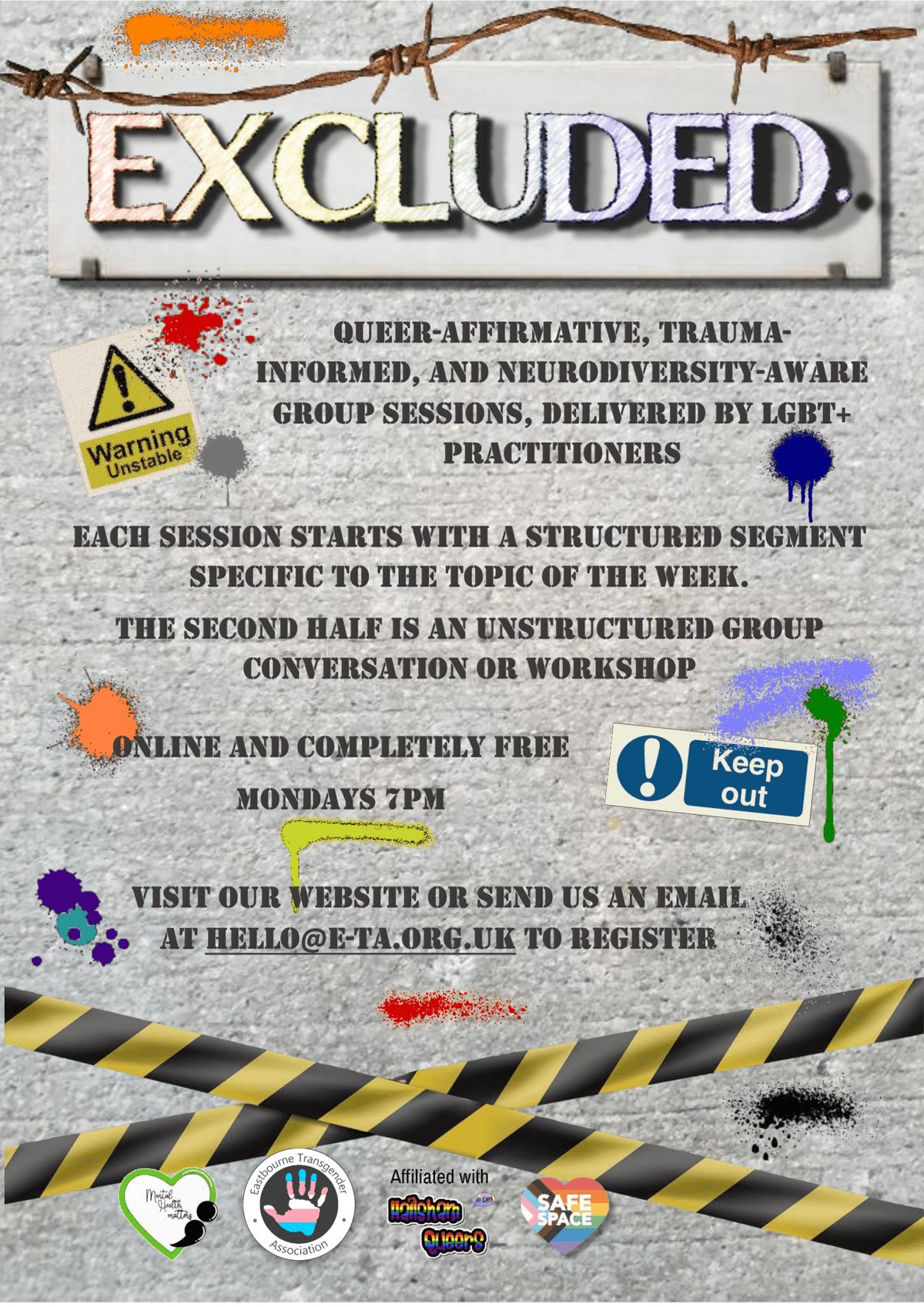 Starting 20th October 2025, we will be running an hour-long, semi-structured, online session each week between 7 and 8pm. All sessions are run by LGBT+ professionals, and will focus on topics and tools specifically chosen to be of benefit to queer people.